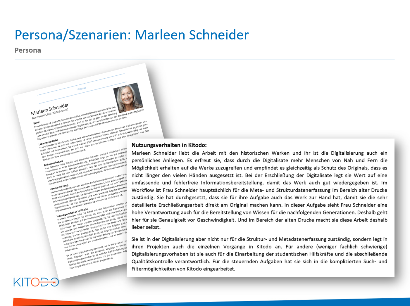 Personas sind fiktive Persönlichkeiten, die stellvertretend für einzelne Zielgruppen eines Dienstes entwickelt werden. Die Beschreibungen enthalten vielfältige Informationen über die Persona und laden damit dazu ein, den zu entwickelnden Dienst aus der Perspektive der jeweiligen Persona zu beurteilen, jenseits von abstrakten Anforderungen. Darüber hinaus helfen Personas dabei, Prioritäten zu setzen und die Zielerreichung zu überprüfen. Es empfiehlt sich, für jedes strategische Ziel eine Persona zu erstellen, mindestens drei bis fünf Personas insgesamt.