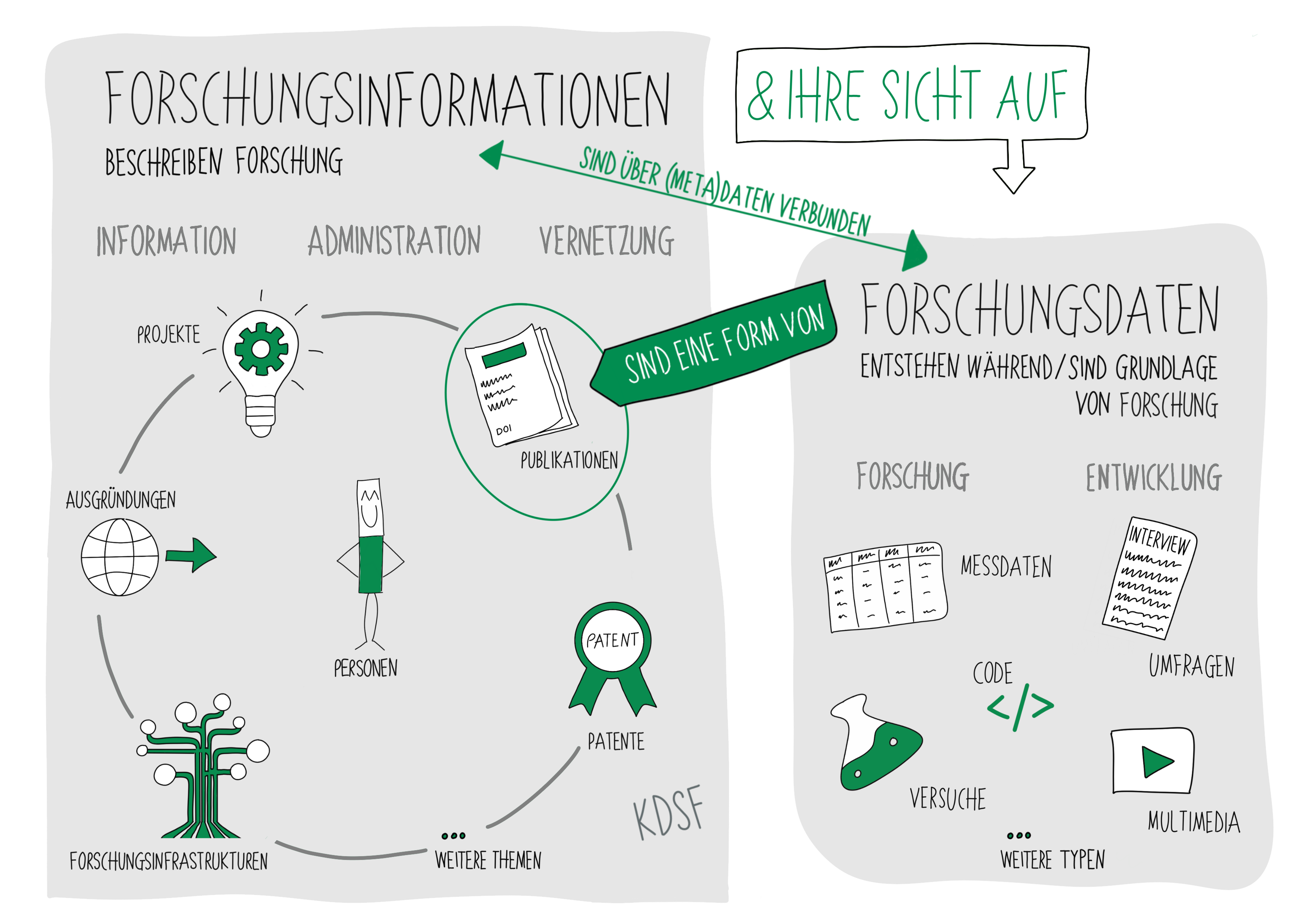 Die Schnittmenge von Forschungsdaten und Forschungsinformationen liegt, wie in Abbildung 10.2 dargestellt, im Bereich Publikationen. Während sich allerdings Forschungsinformationen eher auf klassische, kontrolliert publizierte Dokumente beziehen, geht die Publikation von Forschungsdaten weit darüber hinaus und schließt alle Formen von Aufzeichnungen wie Notizen, Zwischenergebnisse und Forschungssoftware mit ein.