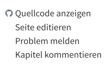 Bearbeitungsvorschläge und Kommentare in Google Docs („Kapitel Kommentieren“). Dies ist im Zweifelsfall die einfachste Methode aber möglicherweise etwas langsamer: Beiträge von Google Docs werden in unregelmäßigen Abständen von der Redaktion in die Markdown-Quellen übernommen und die Google Docs Dokumente ebenso unregelmäßig aktualisiert. Bilder, Literaturverzeichnis und Anhänge wie das Glossar können auf diese Weise nicht geändert werden.